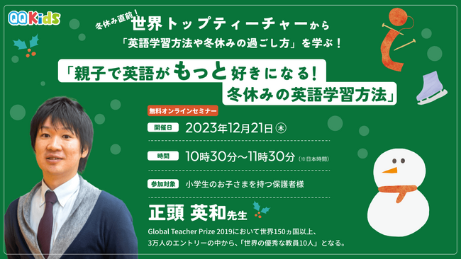 株式会社QQEnglish (本社:東京都渋谷区、代表取締役:藤岡 頼光)は、提供するオンライン英会話サービス「QQキッズ」にてスピーカーに正頭 英和先生をお招きし、冬休みの英語学習方法に関する無料オンラインセミナーを12/21(木) 10時30分より開催いたします。なお、当ウェビナーは、主に小学生のお子様がいらっしゃる保護者の方を対象となります。また、QQキッズの会員・非会員を問わず、どなたでも参加いただけます。ぜひお気軽にご参加ください!