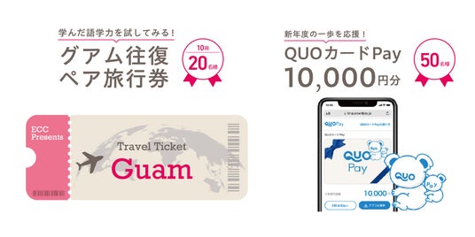ECC外語学院では2026年4月30日(木)まで、ご入学された方の中から抽選でグアム往復ペア旅行券などが当たる「春の入学応援キャンペーン」を実施しています。さらに「ECCキッズなんば校」では、グランドオープンを記念し、キッズなんば校限定の来校特典としてECCオリジナル「大谷翔平選手 クリアファイル&メモノート&ステッカー」をプレゼントいたします。