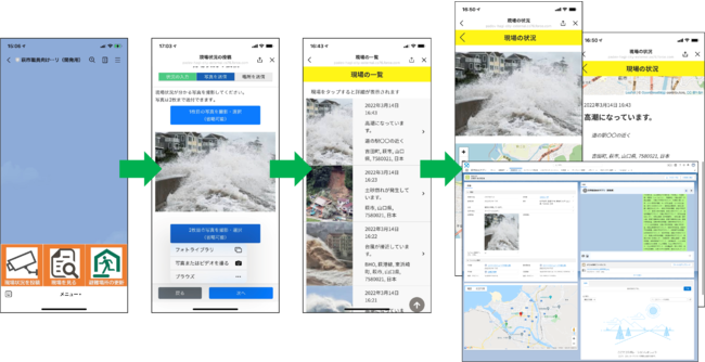 災害現場状況の投稿/編集/確認画面イメージ(萩市職員のスマートフォン/PC画面)