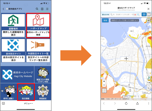 ハザードマップ画面イメージ(萩市民のスマートフォン画面)