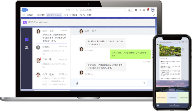 SalesforceとLINE、SalesforceとSMSをつなぎ、One to Oneコミュニケーションを実現し、顧客が欲しい情報を欲しいタイミングでお届けし、顧客とのエンゲージメントを高めることを可能にします。