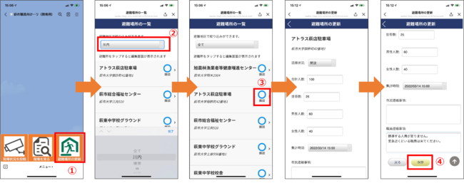 避難場所に派遣された萩市職員が現地でスマートフォンを使って避難場所の状況を更新することができます。現場で実際の状況を見ながら更新できるので、より最新の状況を萩市民に伝えることが可能になります。