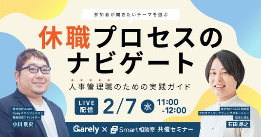 法人向け健康管理ソリューションサービスCarely(ケアリィ)を提供する株式会社iCARE(本社:東京都渋谷区、代表取締役CEO:山田洋太)は、法人向けオンライン対人支援サービス「Smart相談室」を提供する株式会社Smart相談室(本社:東京都港区、代表取締役・CEO:藤田康男、以下Smart相談室)と共同で、人事管理職向けに休職予防・対応の実践ガイドセミナーを開催します。両社への休職者対応に関するお問い合わせは多く、その中でも事前に参加者が投票したテーマについて、登壇者2名によるディスカッション形式で深掘り、解説いたします。お申込・テーマの投票をお待ちしております。