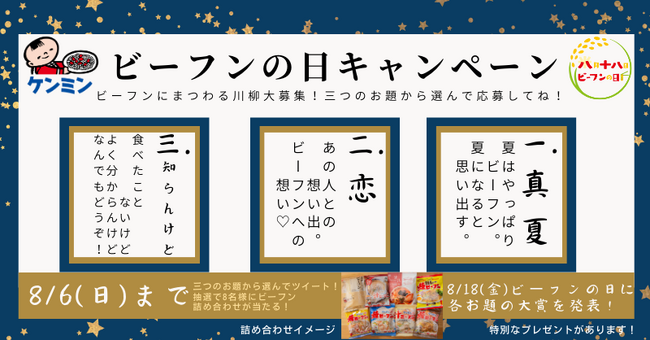 8月18日は「ビーフンの日」。ケンミン食品株式会社(兵庫県神戸市・代表取締役社長:高村祐輝)は、7月18日(火)から8月6日(日)まで、Twitterで「ビーフン川柳キャンペーン2023」を開催しています。ビーフンにまつわる川柳を募集し、応募者には抽選で8名様に「ビーフン詰め合わせセット」をプレゼントします。