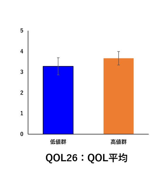左図について:生活の質の質問紙(QOL26)の評価の結果、入浴で体温を高めている群が良好であったことを意味しています。