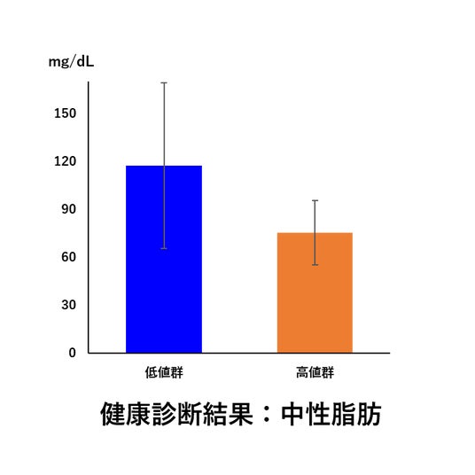 左図について:健康診断の結果、入浴で体温を高めている群が中性脂肪の値が低いことを意味しています。
