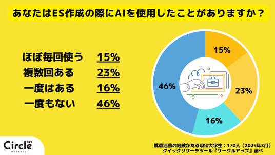 ES作成という最重要フェーズでの生成AI使用頻度を見ると、「ほぼ毎回使う」学生は15%、「複数回ある」が23%、「一度はある」が16%という結果になりました。