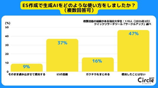 ES作成における具体的なAIの使い方を聞いたところ(複数回答可)、「ESの添削」が37%で最多。次いで「ガクチカをまとめる」が16%、「ES課題をそのまま読み込ませて使用する」はわずか9%にとどまりました。