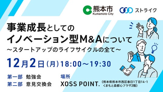 株式会社ストライク(本社:東京都千代田区、代表取締役社長:荒井邦彦)は2024年12月2日(月)に、熊本市と共催でセミナーを実施いたします。本セミナーでは、事業成長の戦略としてのイノベーション型M&Aについて、実際にM&Aを活用された事例をもとにお話しさせていただきます。会場は、起業家等の発掘・育成に取り組む熊本市初のスタートアップ支援施設XOSS POINT. (クロスポイント)です。