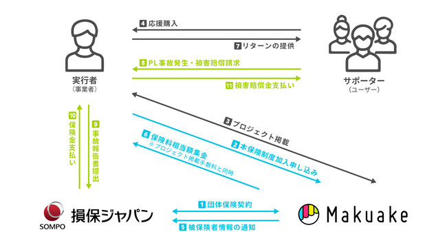 本保険制度は、当社が契約者になり、加入を希望する実行者を被保険者とし、実行者が「Makuake」及び「Makuake Global」を通じてサポーターに提供するリターンに起因したPL事故による損害を補償対象とする、団体PL保険です。