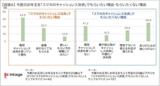 では逆に、お年玉をもらう側の若者はどう思っているのでしょうか。20歳以下の人に、お年玉をキャッシュレス決済でもらいたいか、そしてその理由をたずねました。「キャッシュレス決済でもらいたい」という人は29%でした。その人たちの主な理由は、「普段キャッシュレス決済を使っていて便利」(64%)でした。一方、7割を占めた「キャッシュレス決済でもらいたくない」人の半数が挙げた理由は「ありがたみが感じられない」でした。【図表5】【図表6】