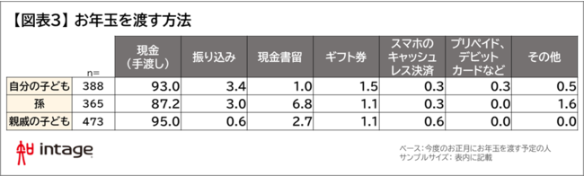 キャッシュレス決済が急速に浸透している昨今、お年玉を渡す方法としてどれくらい活用されているのかを見てみましょう。渡す相手が、自分の子ども、孫、親戚の子ども、いずれの場合も、「現金での手渡し」という人がほとんどで、「スマホのキャッシュレス決済」という人は1%にも満たない結果となりました。手渡し以外の方法としては、キャッシュレス決済より、「現金書留」や「振り込み」の方が多いのが現状ということがわかりました。【図表3】
