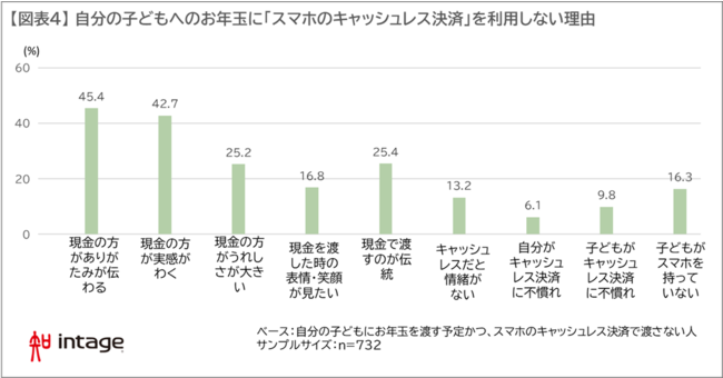 キャッシュレス決済が進んでも、お年玉は現金での手渡し派が圧倒的に多い背景に、どういった理由があるのでしょうか。最も多くの人が挙げた理由は「現金の方がありがたみが伝わる」「現金の方がもらったという実感がわく」で、いずれも40%超の回答を集めました。次いで、「現金の方がうれしさが大きい」「現金で渡すのが伝統」も、それぞれ4人に1人が理由として回答。お正月という伝統行事に紐づいた風習であるお年玉に関しては、従来通りの渡し方を大切に思う人が多いことが明らかになりました。【図表4】