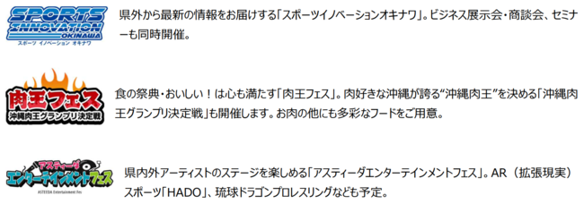 株式会社Alpaca.Lab、アルビジア株式会社、株式会社イー・コード(auショップ)、株式会社ポイントピュール(Ryu Spa)、沖縄科学技術大学院大学 OIST、沖東交通グループ、株式会社識学、アウモ株会社、株式会社シナジービーピー、XTENDなど、沖縄県内で商品・サービスを提供する企業を中心に「泡盛フェス」含め県内外の44社が出展予定。