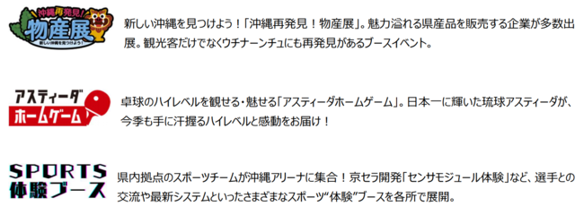 ●参加企業:フォーモストブルーシール株式会社、株式会社ロカヒ、ラグスタ株式会社、株式会社青い海、株式会社アクアメディカル研究所。ファイテン株式会社(ファイテンショップ沖縄PARCOCITY店)、株式会社バタフライピー研究所、株式会社沖縄県物産公社(わしたショップ国際通り店)、一般社団法人 琉球びんがた普及伝承コンソーシアム、タピック沖縄株式会社、株式会社西自動車商会、株式会社アソシア、EMウェルネス暮らしの発酵ライフスタイルリゾート、エンドライン株式会社、株式会社ネクストヒーローズ沖縄、株式会社478COMPANY、エトワール株式会社、知名オーディオ、南西食品株式会社、楽学喜support ACCENDO、有限会社おおば、沖縄電力株式会社、沖縄ケーブルネットワーク株式会社、株式会社ヴィアン(ミスタードーナツ)、Glowing株式会社、
