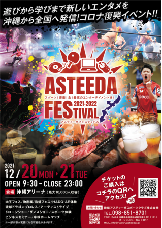 2021年12月20日(月)、21日(火)に沖縄アリーナで初めて開催される来場者数1日1万人を目指す琉球アスティーダの大規模祭典。“スポーツ!音楽!食!最高のエンターテインメントを!”のテーマのもと、withコロナ時代のコロナ復興イベントとして心にエナジー、日常に元気を届け、明日を照らす機会を創造。