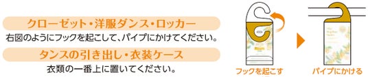 今回発売する『アロマ香る ダニよけサシェ 金木犀の香り』は、衣類の収納空間にかけるだけで、ダニ※1を寄せつけにくくする商品です。クローゼットや洋服ダンスのパイプに本体のフックをかけるだけの簡単な使用方法です。そのまま引き出しに入れてもご使用いただけます。また、消臭成分配合で、収納空間にこもったニオイ※2を消臭します。香りは、天然アロマ成分のモクセイ花エキスを使用した「金木犀の香り」を採用し、収納空間内に甘くて心地良い香りがふわっと広がります。