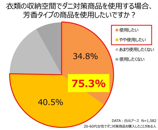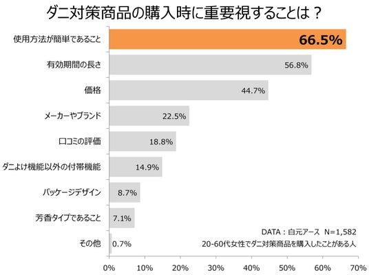ダニ対策商品はシートタイプ、ミストタイプをはじめ様々な商品が発売されています。当社が独自に調査したところ、ダニ対策商品を購入したことがある方は「使用方法が簡単であること」を商品購入時に最も重要視していることが分かりました。また、衣類の収納空間に使用する場合、「芳香タイプ」の商品に対するニーズが高いことが分かりました(下図参照)。