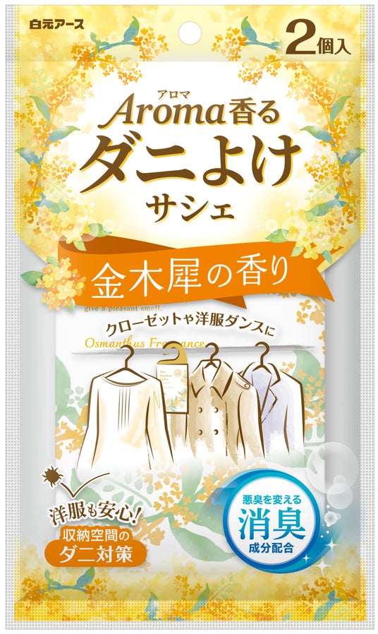 白元アース株式会社(本社:東京都足立区、社長:吉村一人)は、衣類の収納空間のダニよけができる『アロマ香る ダニよけサシェ 金木犀の香り』を8月1日より数量限定発売いたします。