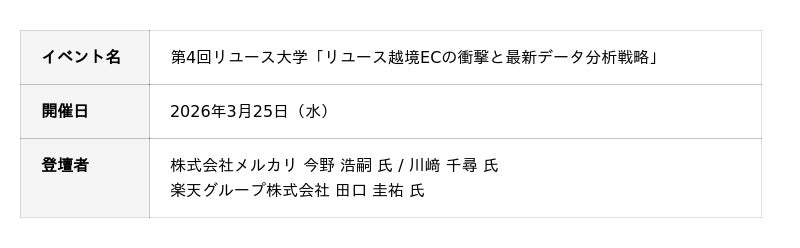 リユース事業者の成長を支援する実践セミナー「リユース大学」は、2026年3月25日、株式会社メルカリ・楽天グループ株式会社の担当者を招いた第4回セミナーを開催いたしました。