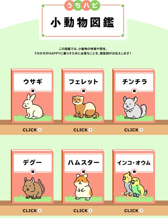 「うちの子 HAPPY PROJECT」は、「今日から実践でき、すぐに役立つうちの子の病気・事故対策」をテーマに、当社の獣医師がリアルな数字やイラストなどを交え、わかりやすく解説しています。2017年の公開以来、犬・猫向けのコンテンツを発信してまいりましたが、今回エキゾチックアニマル(小動物)も加わり、より幅広い種のうちの子が飼育者の方と共にHAPPYになれるような情報発信を目指していきます。
