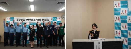 6月のコンビニ「サギ阻止月間」スタートに先立ち、兵庫県コンビニエンスストア防犯対策協議会と兵庫県警察による「団結式」が実施され、コンビニ店員向けのメッセージ動画に出演している警察庁特別防犯支援官の岩立沙穂氏が参加しました。