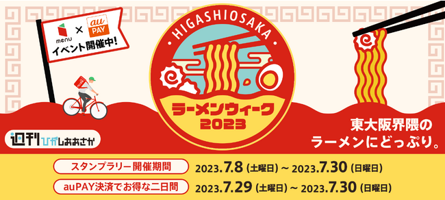 大阪府東大阪市界隈のラーメン店、約30店舗が「ラーメンウィーク2023 ~夏のmenu×au PAY祭~」に集結。7月29日(土)・30(日)はぜひ現地へ足を運んでお得に美味しいラーメンをご堪能ください。