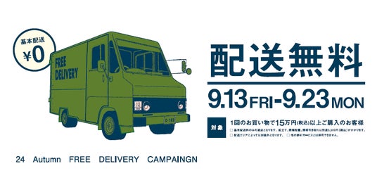 9月13日(金)~9月23日(月・祝)までの期間、15万円以上ご購入いただくと家具配送料が無料に!