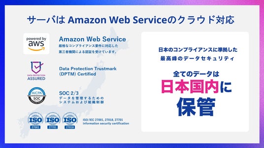 最高峰のデータセキュリティでデータは国内保管。有名企業が続々導入し、国土交通省の認定ツールに。「Lark」のデータは全て国内のサーバに保管され、AWS(Amazon Web Services)のクラウドに対応しています。