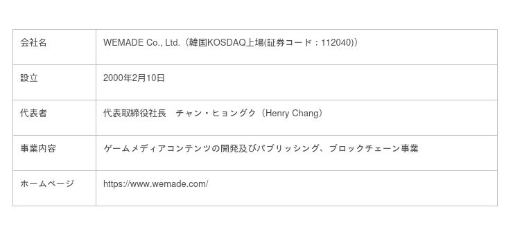 「WEMADE」は2000年2月10日に韓国で設立されたPCオンラインゲーム及びモバイルゲームの開発/運営会社であり、「ICARUS ONLINE」、「MIR4」、「Mir M」など多数ゲームタイトルの開発・サービスを行っている会社である。韓国のKOSDAQ上場企業であり、傘下には世界各国の支社と複数のゲームスタジオがある。