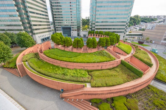 「ベリーニの丘」は、野村不動産が手掛けた横浜ビジネスパーク(横浜市保土ヶ谷区)の中心にある景観施設です。著名なイタリア人建築家兼デザイナー、マリオ・ベリーニの設計により1990年に建設されました。その独創的な形状と緑豊かな空間は、近隣の就労者や地域住民にとって大切な憩いの場となっています。