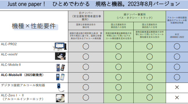 以下の機種はすべて、2023年12月から施行される白ナンバー(安全運転管理者選任事業所)のアルコール検知器義務化、および、緑ナンバーのアルコール検知器義務化で規定されている告示に対応しています。