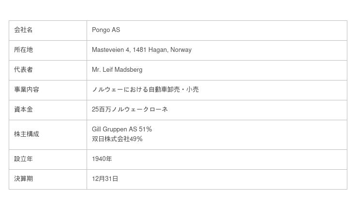双日株式会社(以下「双日」)は、Gill Gruppen AS(ジルグルッペンエーエス) (本社:ノルウェー、以下「Gillグループ」)より、同社傘下で複数のEVブランドディストリビューターを子会社に持つ持株会社であるPongo AS(ポンゴエーエス) (以下「Pongo」)の49%株式を取得しました。