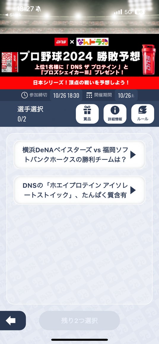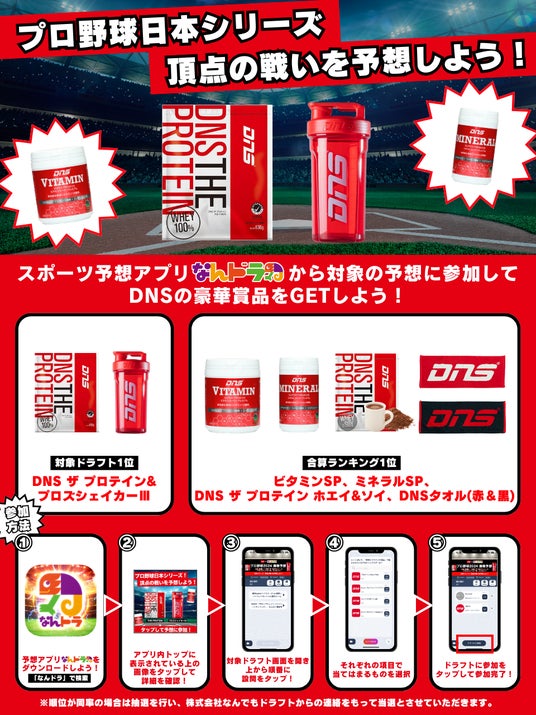 イノベーションの力で新たなスポーツ・エンターテインメントを創造し、まだ見ぬ感動と熱狂を提供するアプリ「なんドラ」を運営する株式会社なんでもドラフト(本社:東京都渋谷区、代表:森井啓允)は、スポーツニュートリションブランドDNS(ディーエヌエス)を展開する株式会社 DNS協賛のプロ野球 日本シリーズ勝敗予想を開催します。