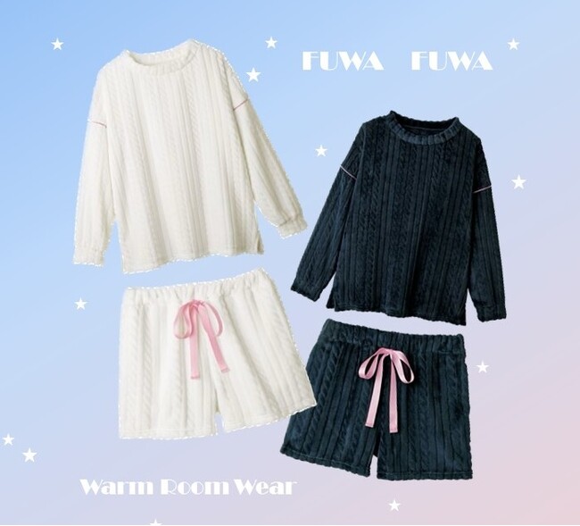 パンツは、着圧ソックスやもこもこソックスが履きやすいようショート丈に。カラーは白×ケーブル柄が冬の鉄板のオフホワイトと、生地の光沢感が感じられるネイビーブルーの2色をご用意しました。ふわふわあたたかくてかわいいルームウェア、この秋おすすめです!