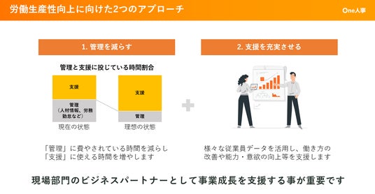 従業員、人事部門、経営者の三方よしの実現にあたり「One人事」は、人材管理・タレントマネジメントに強みを持ちながら、主要な人事業務をワンストップで提供しつつ、従業員の教育や育成を担うシステムとして人と企業の持続的成長に寄与します。また、入力負荷を軽減するとともに管理作業を効率化し、従業員の成長支援に投下できる時間を増やすことで、リアルタイムデータの活用を推進します。