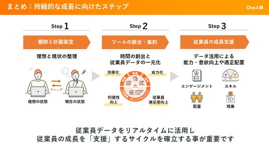 最後に、持続的な成長に向けての取り組みとして「棚卸と計画策定」「ツールの統合・集約」「従業員の成長支援」の3点がポイントです。ステップ1で理想の状態を決め現状とのギャップを整理し、ステップ2では時間の創出と従業員データの一元化に取り組みます。ステップ3で、データ活用による能力・意欲向上、適正配置などに取り組むという、これらのサイクルを回し続けることが重要です。