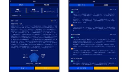 世界最大級の組織開発コンサルティング企業であるDevelopment Dimensions International(DDI)社やKorn Ferry社といった国際的なリーダーシップ基準に準拠したフレームワークを用いて、AIが対話演習の内容を即時に分析し、フィードバックします。さらに、抽出された個人の弱点に対し、AIが次に必要な学習を提案します。この個別最適化された学習サイクルにより、一律のマネジメント研修では難しかった確実なスキル習得と行動変容を実現し、属人的になりがちなマネジメントの型を組織全体で標準化します。