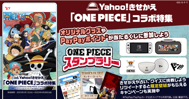 本特集では、Yahoo! JAPANのトップページや検索結果、またAndroidのスマートフォンの壁紙やアイコン、ホーム画面を『ONE PIECE』特別仕様のデザインにきせかえできる「Yahoo!きせかえ」をはじめ、設問に答えると、その日のおすすめファッションアイテムを『ONE PIECE』のキャラクターで占える「きせかえ占い」、「Yahoo!検索」で『ONE PIECE』『ONE PIECE クイズ』と検索すると挑戦できる『ONE PIECEクイズ』など、Yahoo! JAPANならではの多様なコンテンツを提供します。