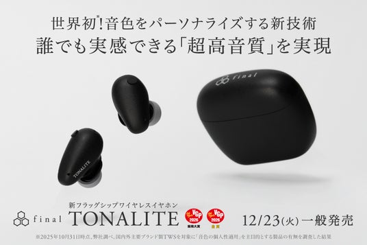 国内オーディオメーカー株式会社final(代表:細尾 満、本社:神奈川県川崎市)は、世界初*1の音色パーソナライズ技術「DTAS(R) for Personalized Timbre(TM)(ディータス フォー パーソナライズド タンバー)」を搭載したフラッグシップワイヤレスイヤホン「TONALITE トナリテ」を2025年12月23日(火)より一般発売いたします。