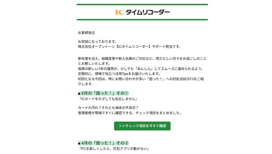 年間1000件以上発生するICタイムリコーダーへのユーザー問合せ情報を整理し「ICカードが反応しない場合の対処」「年度替わりの有給設定」など、発生しやすいトラブルをピックアップ。労務管理者宛にニュースレターとして共有することで、管理者の工数を大幅に削減します。