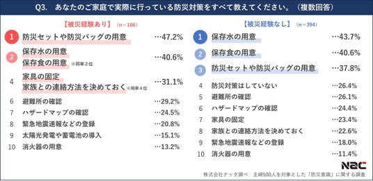 3.主婦が実際に行う防災対策トップ3は、「防災セットや防災バッグ」「保存水」「保存食」の用意。被災経験ありの主婦は「家具の固定」「家族との連絡方法を決めておく」も重視