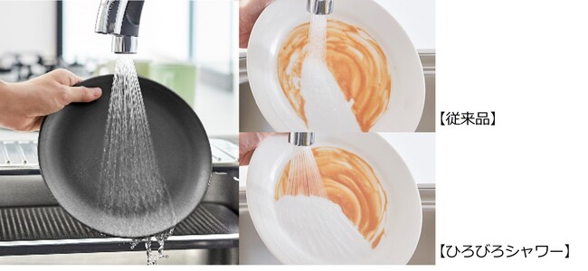 発明奨励賞を受賞した「ひろびろシャワー」に使われている特許技術は、キッチン用水栓のシャワー散水孔の孔角度と出口部分の形状を工夫することで狙い通りの方向にシャワー吐水させることを見出した技術です。「ひろびろシャワー」はこの特許技術を使い、小型化した吐水ヘッドであっても、水流を扇のように1方向だけに広げ、下方にいくほどひろびろとシャワーの水を使用いただけます。これにより、コンパクトなデザイン性と使い勝手を兼ね備え、節水にも貢献するキッチン用水栓を実現しました。一度に広い面積を洗い流せるため洗う時間を短縮できるほか、水が通り抜けてすすぎ洗いが面倒だったザルなどの道具も、ワイドで洗浄力のあるシャワーでサッときれいに洗い流せます。