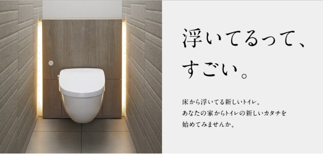 「フロート トイレ」は、床から便器を浮かせ、パネル付きキャビネットに間接照明を設けた住宅向け壁掛トイレです。