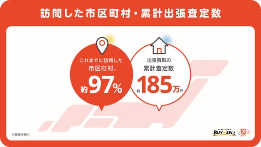 当社事業の中心となる出張買取の累計査定数は約185万件。これまでに訪問した市区町村(離島を除く)は約97%(1,636/1,683市区町村)に達し、全国すみずみまでお伺いしています。