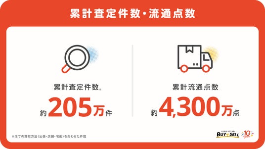 全ての買取方法(出張・店舗・宅配)を合わせた累計査定件数は約205万件と、多くの方にご利用いただきました。累計流通点数は約4,300万点。日本国内の3人に1人のお手元にお届けできる点数です。
