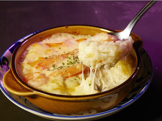 バターライスにホワイトソース、チーズをのせ、ぷりぷりな海老、まるで本物のカニのようカニ風味かまぼこ「ほぼカニ(R)」をトッピングした、昔の喫茶店の定番シーフードドリアをイメージして仕上げました。