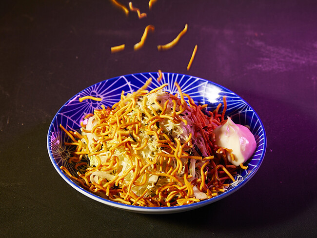 千切りキャベツと塩昆布の名コンビに、パリパリ食感が楽しめるラーメンスナックをたっぷりトッピングしました。