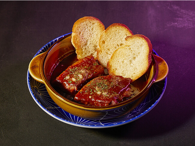 信州味噌と赤ワインを使用したデミグラス味噌ソースに、レンゲでほぐせるやわらかな豚バラ肉がごろっと入ったボリューム満点の煮込みです。