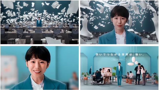 虚空の中一人佇み、一筋の光のもとで「なぜ?どうして?」と働き手が仕事において大切にする価値観について語る夏帆さん。Wantedlyを通じて会社の「想い」が伝わり、その「想い」に共感したメンバーが集まり、何もなかった空間が活気があふれるオフィスへと変貌。ラストシーンではそんな賑やかなオフィスの中で夏帆さんが「想いでつながる採用は、強い」と満足気に微笑む。